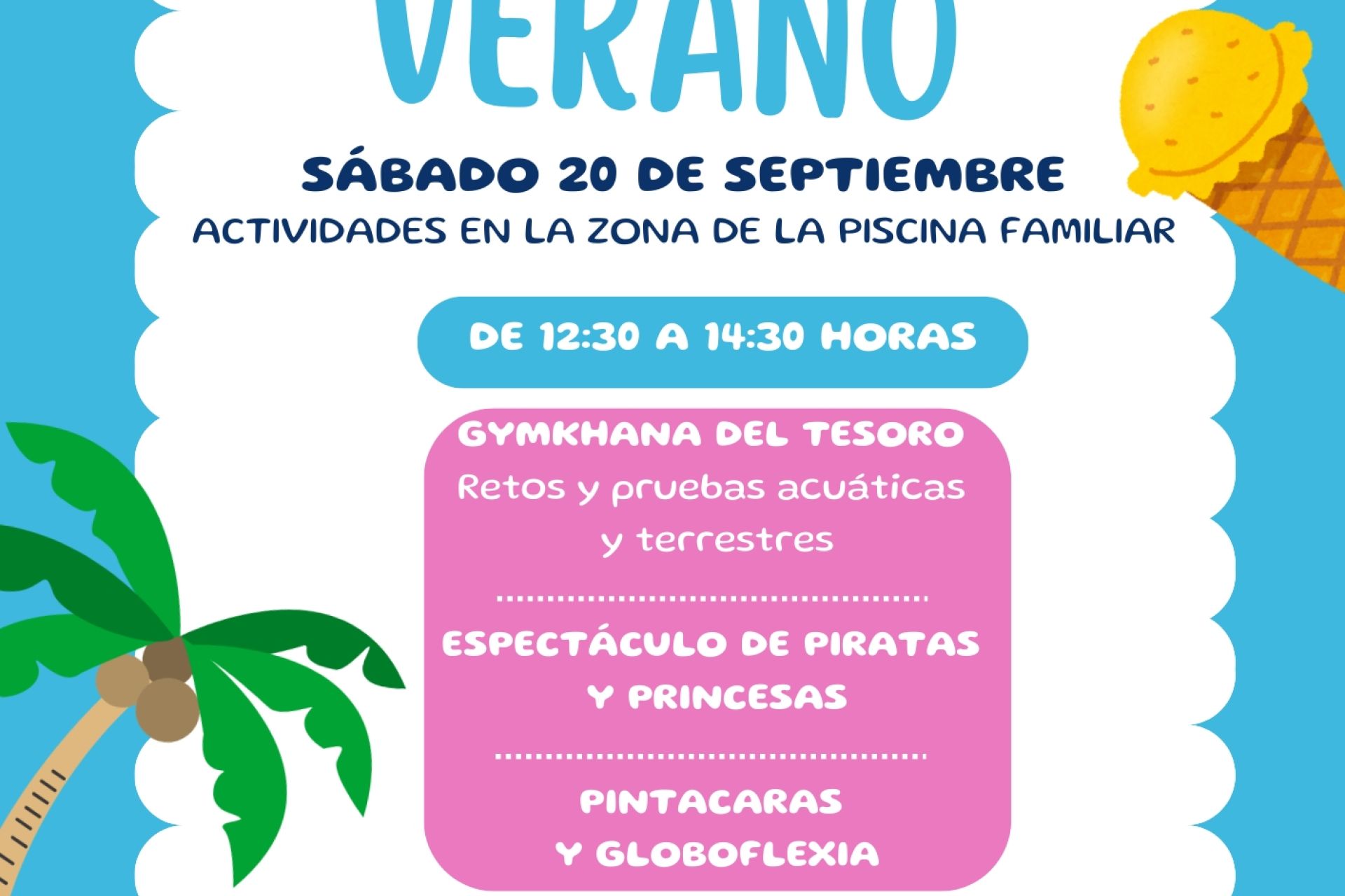 El sábado 20 de septiembre, te esperamos a partir de las 12:30 h con actividades refrescantes hasta las 19:00 h en la zona de la piscina familiar para disfrutar con una gymkhana del tesoro, piratas y princesas, globoflexia, pintacaras y castillos hinchables. ¿Te lo vas a perder?