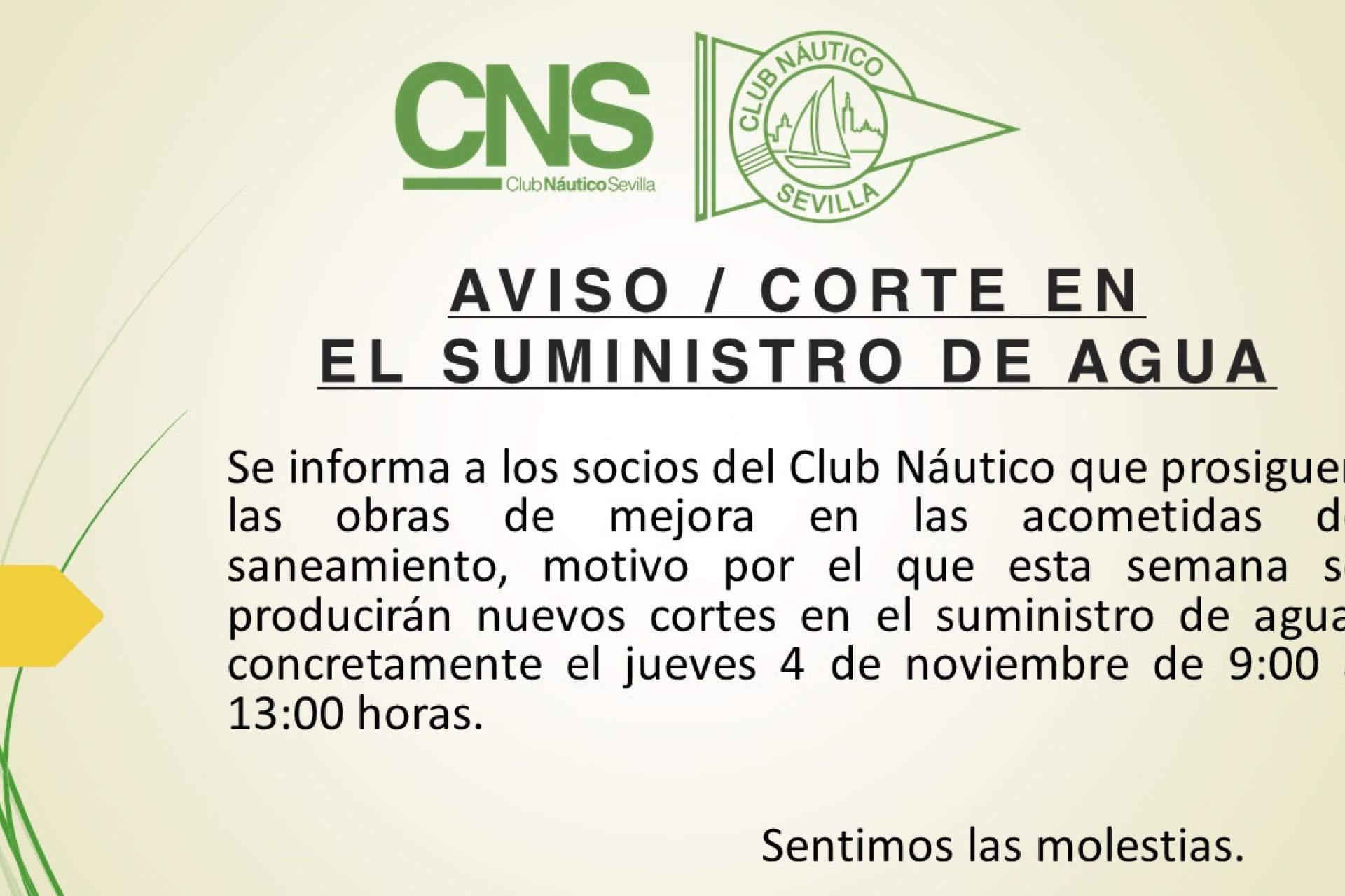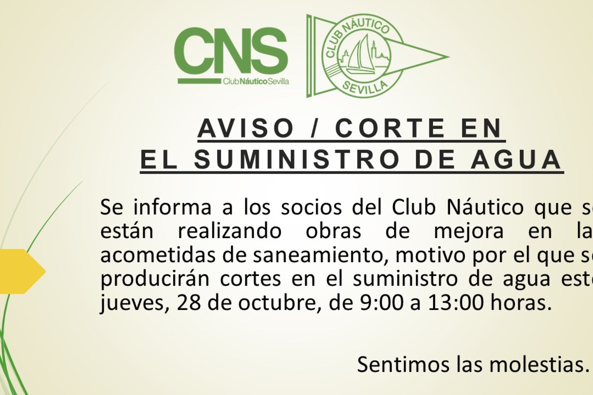 Se informa a los socios del Club Náutico que se están realizando obras de mejora en las acometidas de saneamiento, motivo por el que se producirán cortes en el suministro de agua este jueves, 28 de octubre, de 9:00 a 13:00 horas.