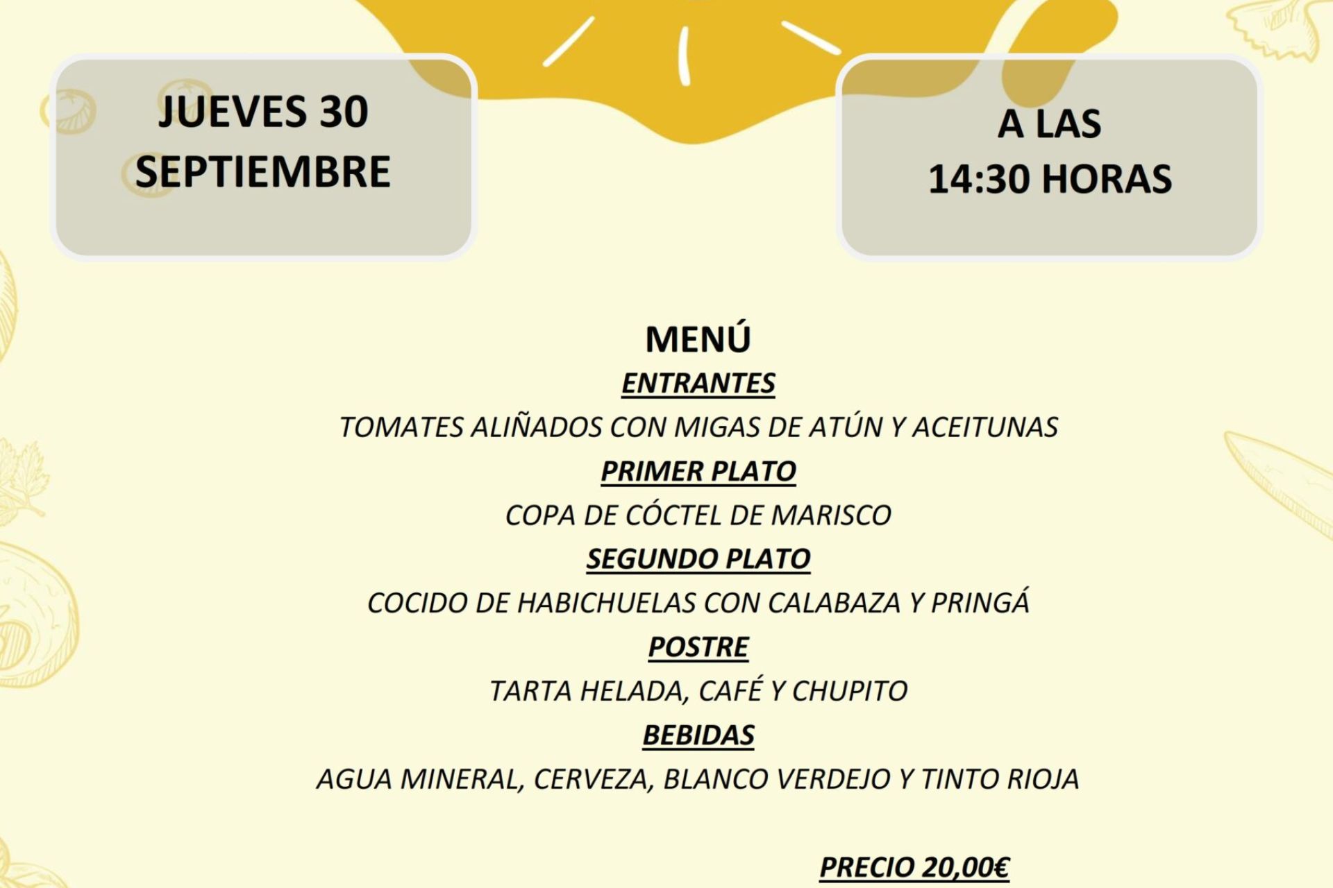 Convocatoria de la tertulia mensual para jubilados del Club Náutico del jueves 30 de septiembre. Menú, 20€. Se ruega confirmación previa con 2/3 días de antelación en Conserjería o el 954 454 777. Se establecerán las medidas de seguridad establecidas por normativa por la Junta de Andalucía.