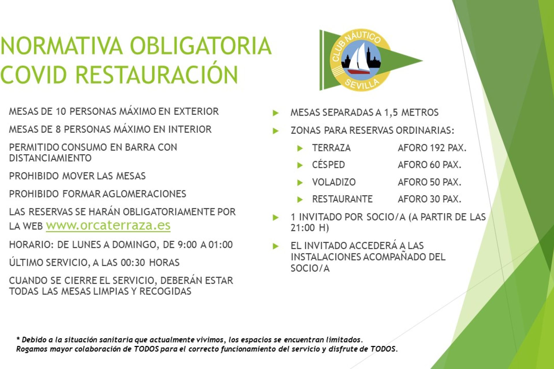 Normativa de los servicios de restauración del Club Náutico Sevilla desde el 2 de septiembre en aplicación del BOJA de 1 de septiembre de la Junta de Andalucía.