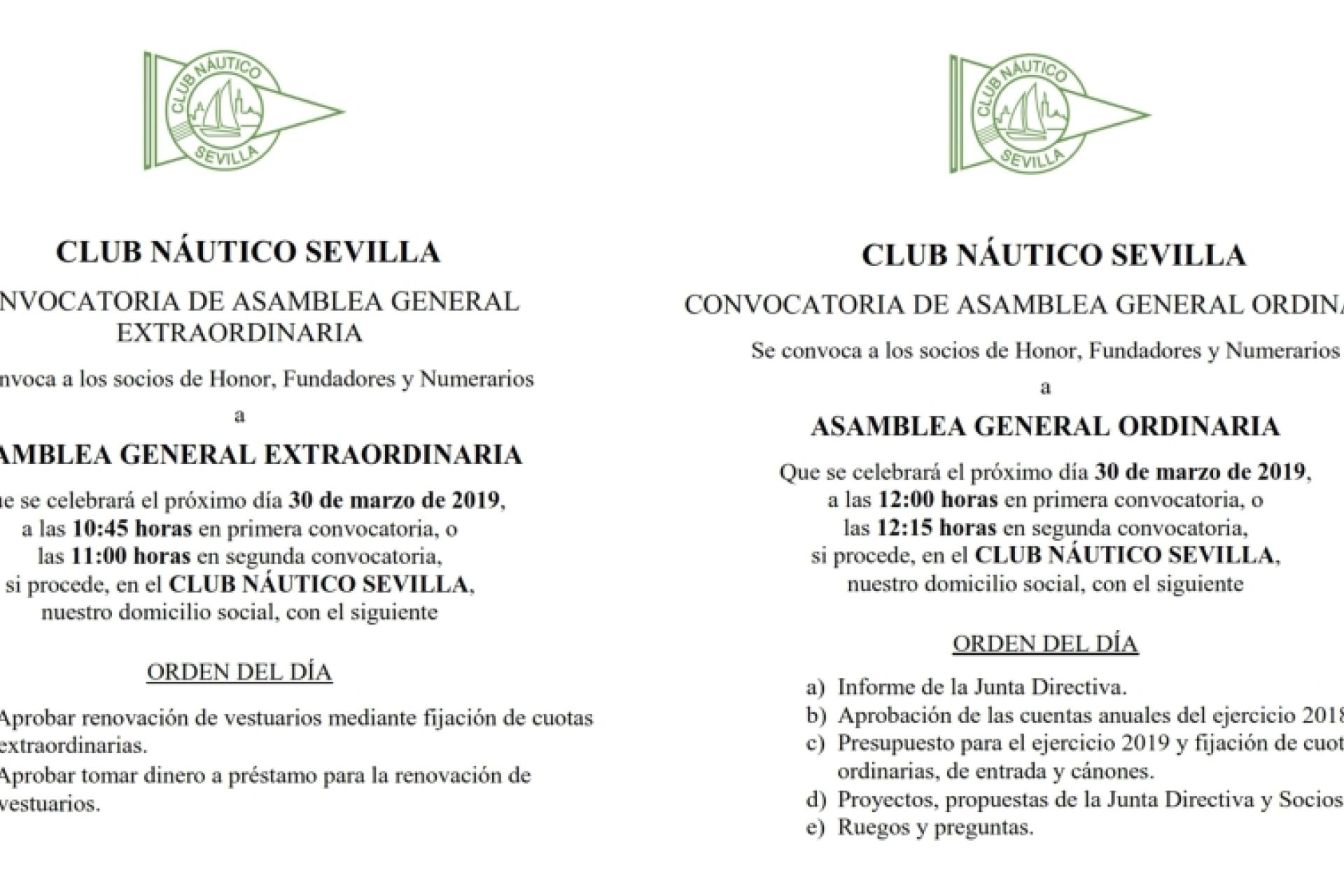 Convocatoria de Asamblea general ordinaria y extraordinaria del Club Náutico Sevilla