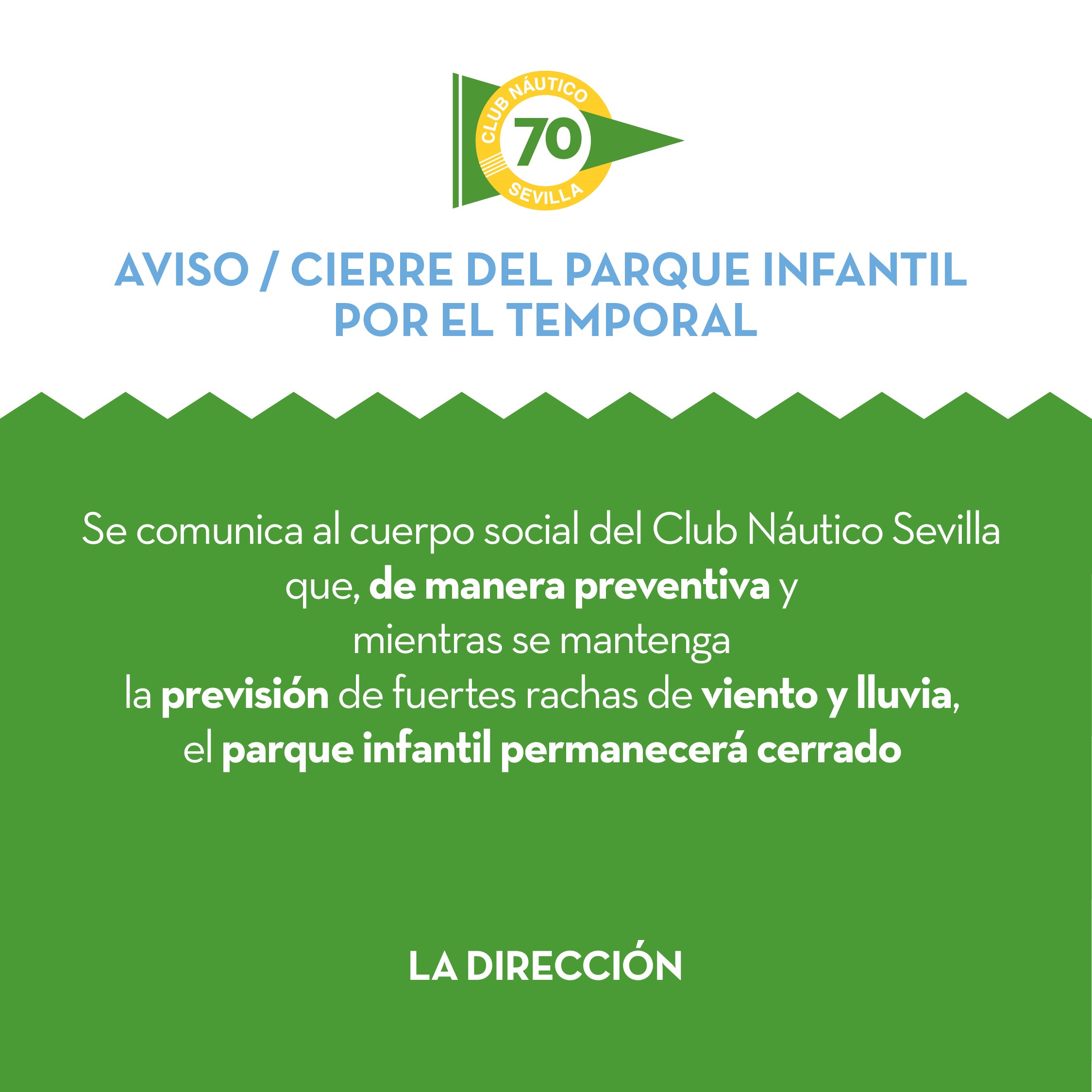 Se comunica al cuerpo social del Club Náutico Sevilla que, de manera preventiva y mientras se mantenga la previsión de fuertes rachas de viento y lluvia, el parque infantil permanecerá cerrado.