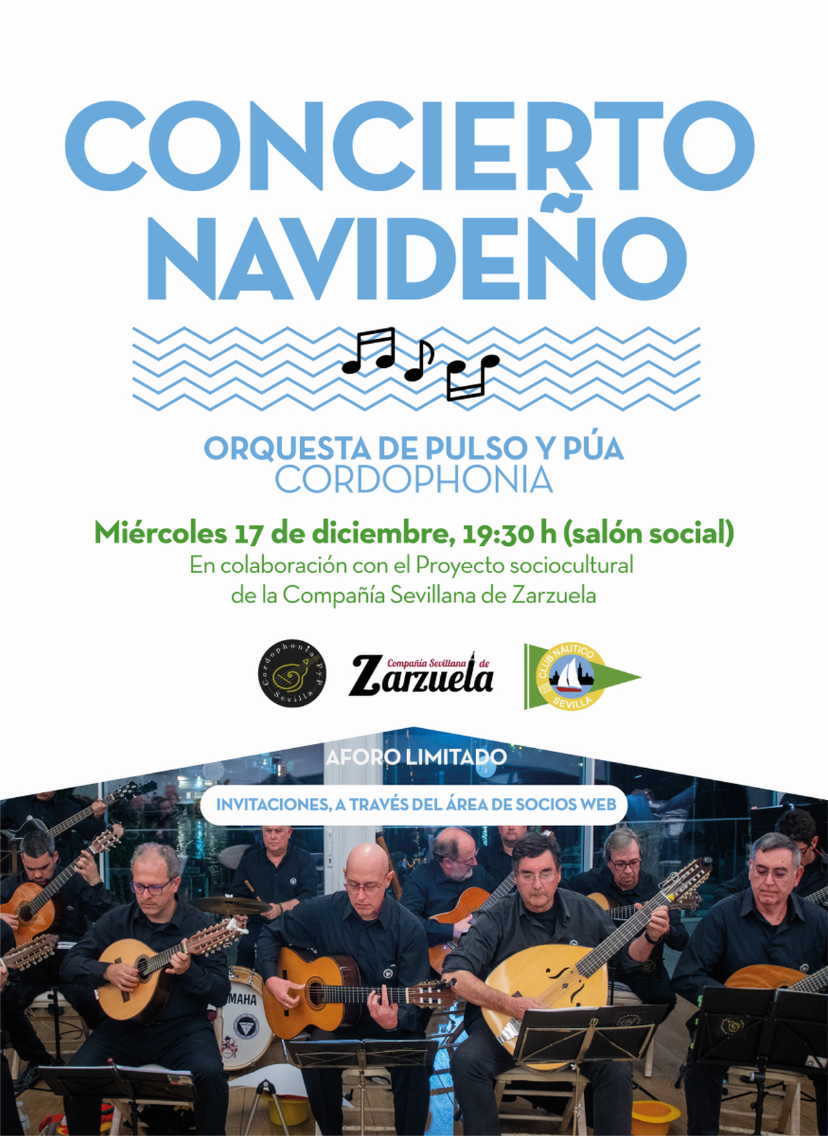 El miércoles 17 de diciembre a las 19:30 horas en el salón social con la actuación de la orquesta de pulso y púa CordoPhonia PyP. Reserva de invitaciones, a través del ÁREA DE SOCIOS WEB Aforo limitado.