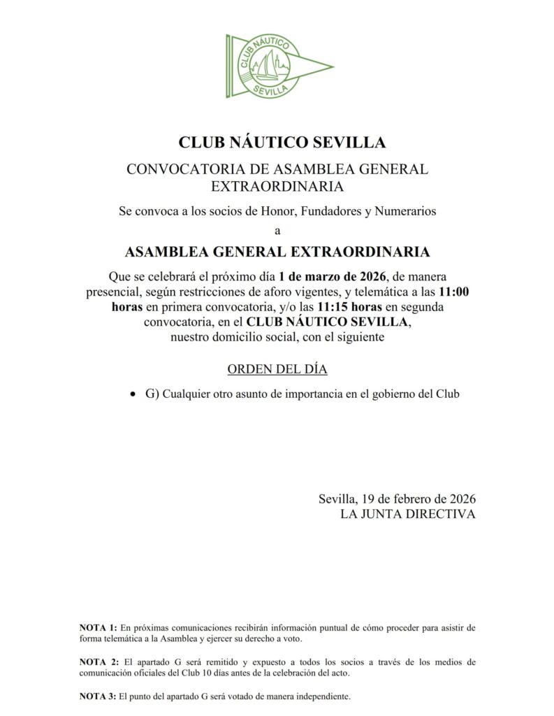 Los socios de Honor, Fundadores y Numerarios del Club Náutico Sevilla están citados de forma presencial y telemática el domingo 1 de marzo de 2026 a las 11:00 horas en primera convocatoria o a las 11:15 horas en segunda.