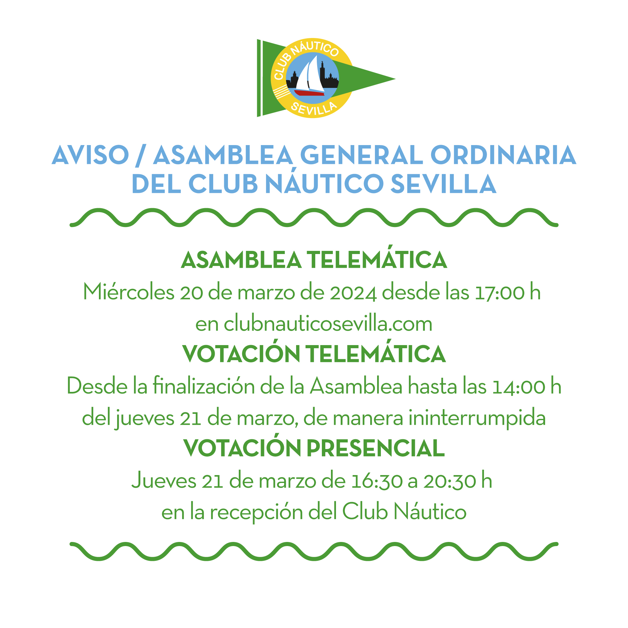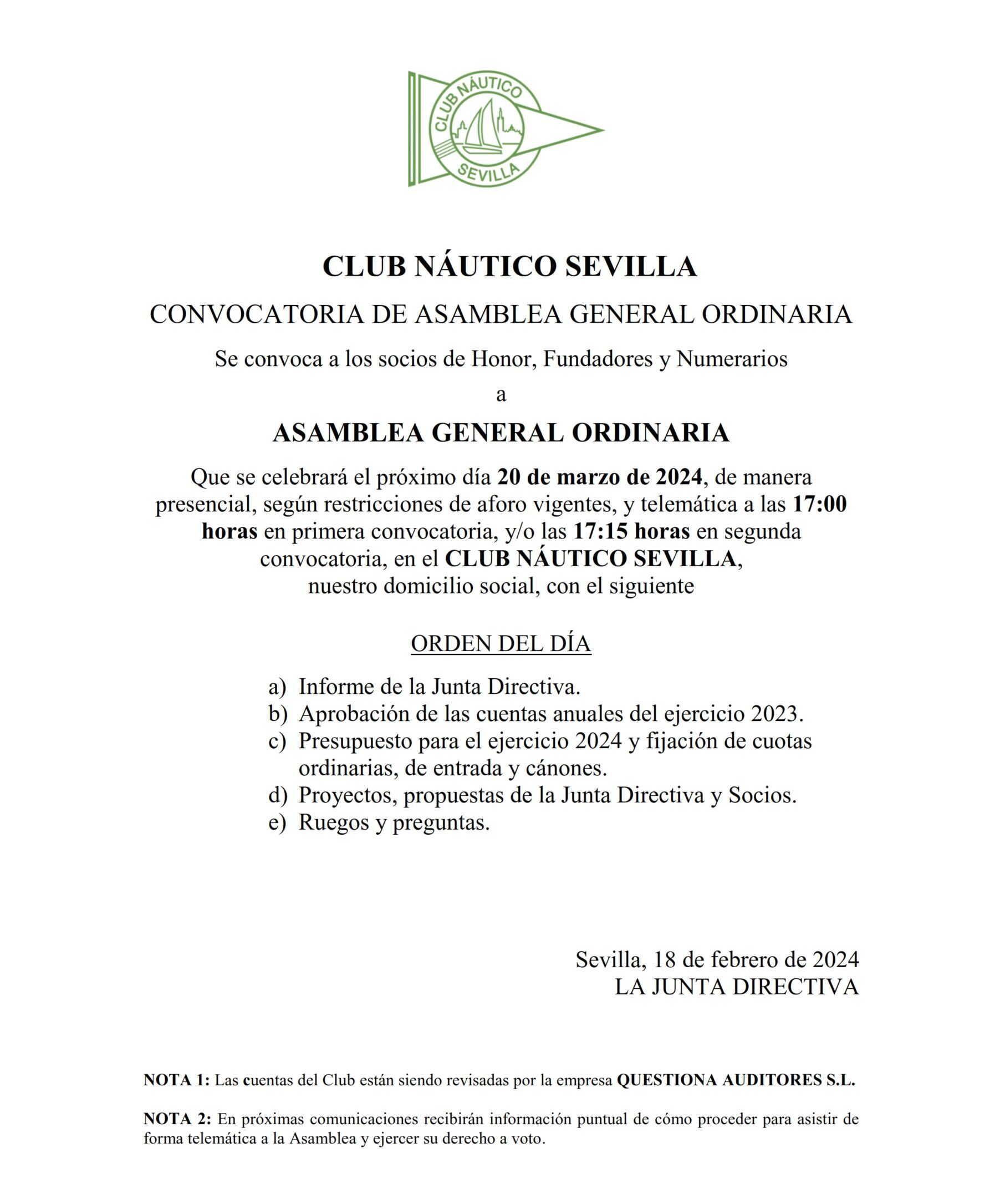 Los socios de Honor, Fundadores y Numerarios del Club Náutico Sevilla están citados de forma presencial y telemática el miércoles 20 de marzo de 2024 a las 17:00 horas en primera convocatoria o a las 17:15 horas en segunda convocatoria.