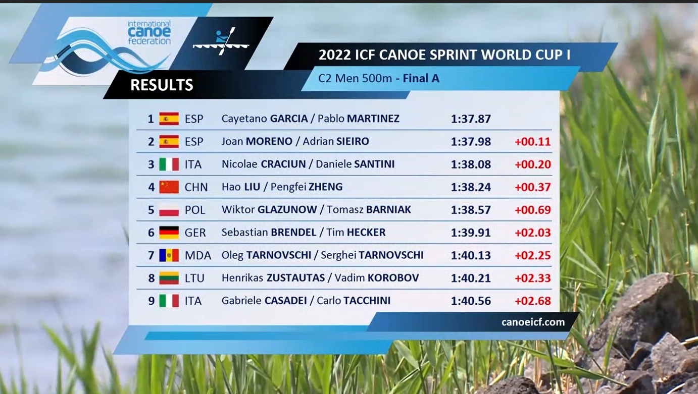 En el primer caso, la canoa doble de los diplomas olímpicos en los Juegos de Tokio Cayetano García de la Borbolla Yaque y Pablo Martínez se ha proclamado campeona sobre la nueva distancia olímpica de 500. Repitiendo el oro logrado el pasado año en la Copa del Mundo de Hungría, los sevillanos han ido de menos a más para imponerse en el sprint con un tiempo de 1:37.87, con sólo 11 centésimas de ventaja sobre el otro barco español presente en la final, formado por Joan Moreno y Adrián Sieiro, segundos con 1:37.99; y de dos décimas sobre los italianos Craciun y Santino (1:38.08).