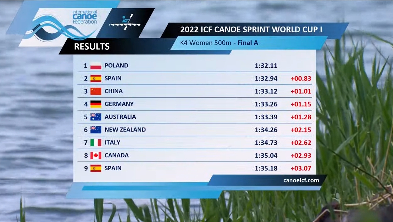 Por su parte, el K-4 500 de la también palista del Náutico Sevilla Carolina García se ha colgado la medalla de plata en la Copa del Mundo de Racice después de otra espectacular remontada. El barco completado con Sara Ouzande, Laia Pelachs y la medallista olímpica Teresa Portela se superaba en la segunda parte de la final para concluir con un tiempo de 1:32.94, sólo superado por el 1:32.11 de Polonia. El podio lo completaba china con un crono de 1:33.12.