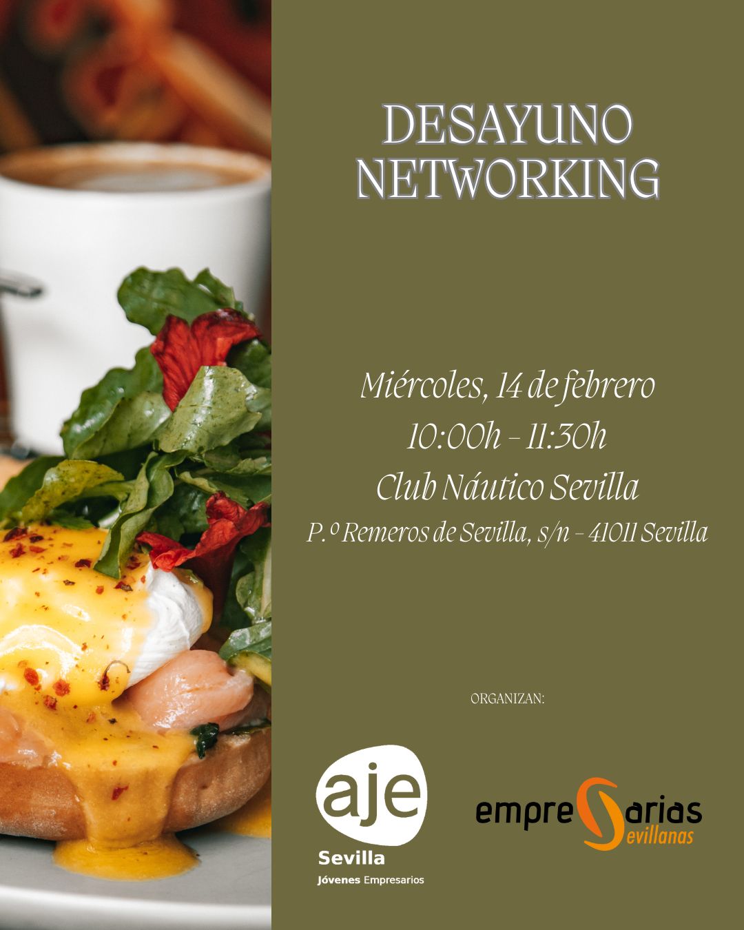 La asociación Empresarias Sevillanas (EESS) y la Asociación de Jóvenes Empresarios de Sevilla (AJE Sevilla) han organizado el miércoles 14 de febrero en el Club Náutico un desayuno networking. Con el objetivo de ofrecer a los asistentes una excelente oportunidad para expandir su red de contactos profesionales mientras disfrutan de un delicioso desayuno, a través de dicho evento se pretende fomentar la colaboración y el intercambio de ideas entre empresarios y profesionales de diversos sectores en un acto abierto al que pueden asistir, previa reserva de plaza, limitadas, tanto socios de EESS y AJE como todas las personas interesadas en conectar con otros profesionales de Sevilla y aprovechar este espacio para crear nuevas oportunidades de negocio.