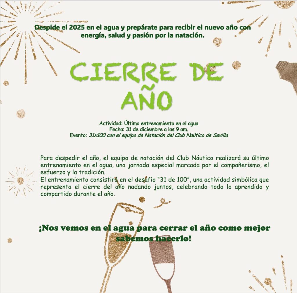 Este miércoles, día 31, te esperamos a las 9:00 horas para finalizar el año compartiendo entrenamiento con el equipo de natación y participando en el desafío 31×100, evento simbólico con el que cerrar 2025 en el agua.