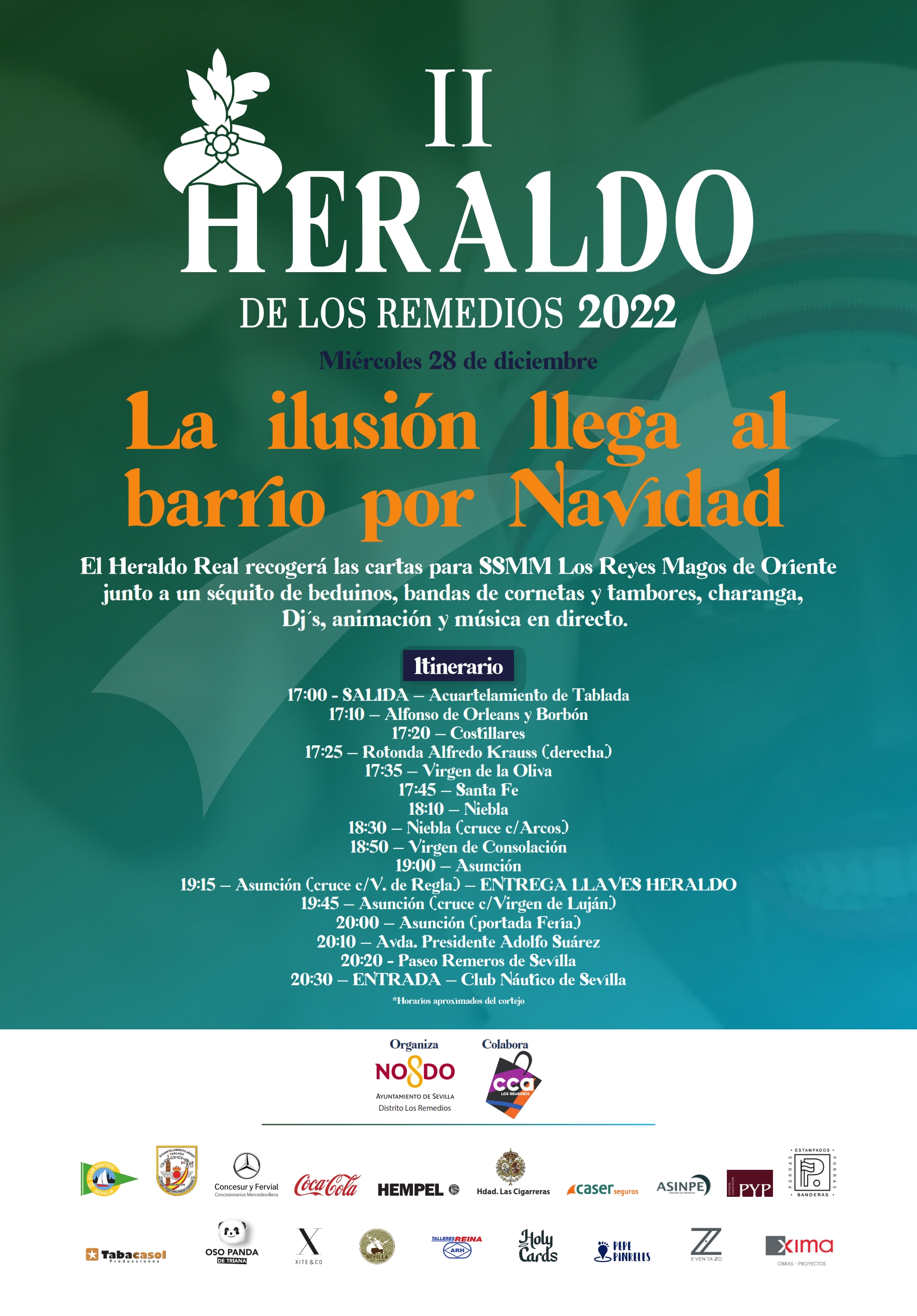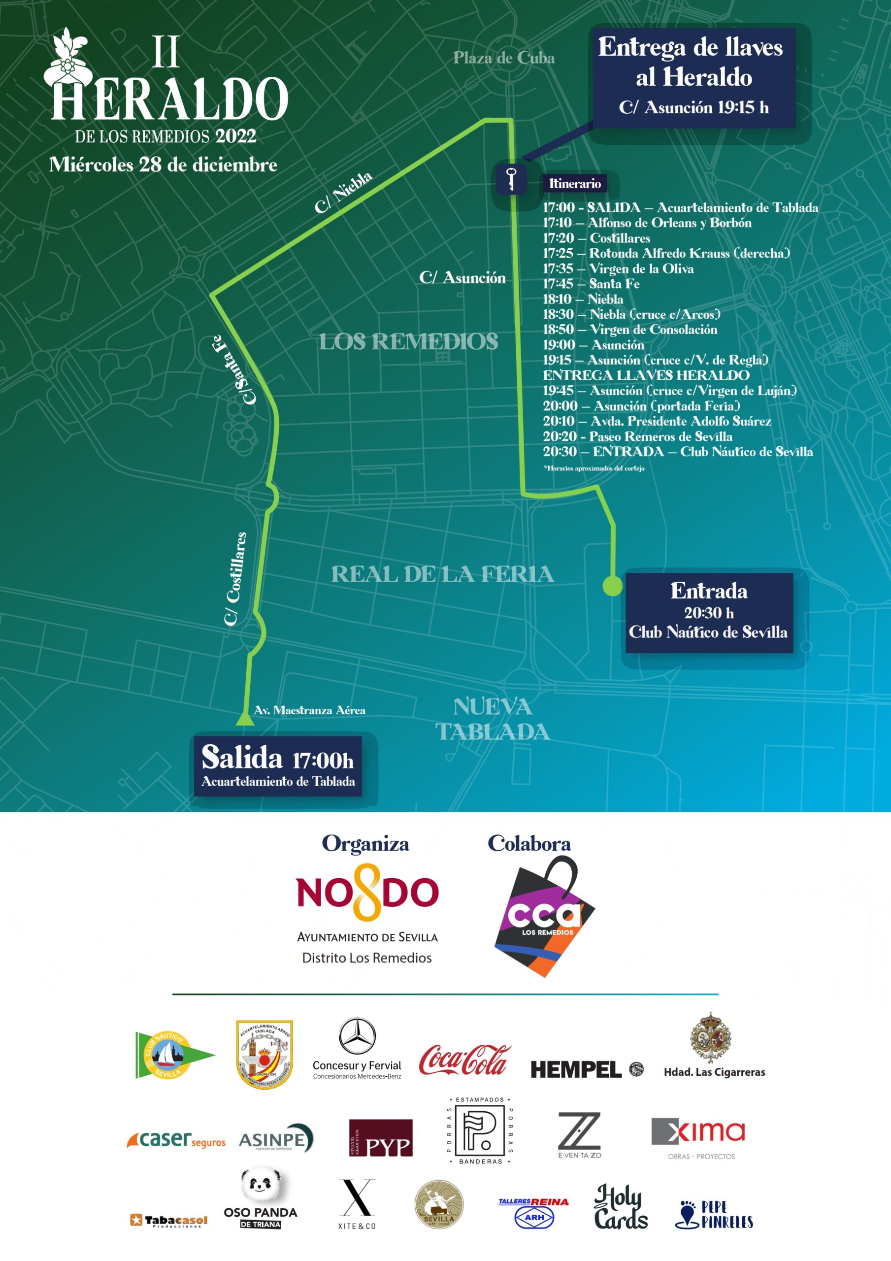 Itinerario oficial del cortejo que el 28 de diciembre partirá de Tablada a las 17:00 h para concluir su recorrido en las instalaciones del Club Náutico sobre las 20:30 h.